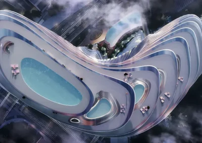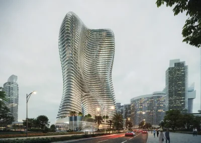Hiperforma wyróżnia się subtelnymi konturami i płynnymi liniami. Fasada, oglądana z każdego punktu, ukazuje nowe oblicze, tworząc wizualną aurę tajemniczości – to wyrafinowana rzeźbiarska forma, która emanuje poczuciem dynamiki i ruchu.
